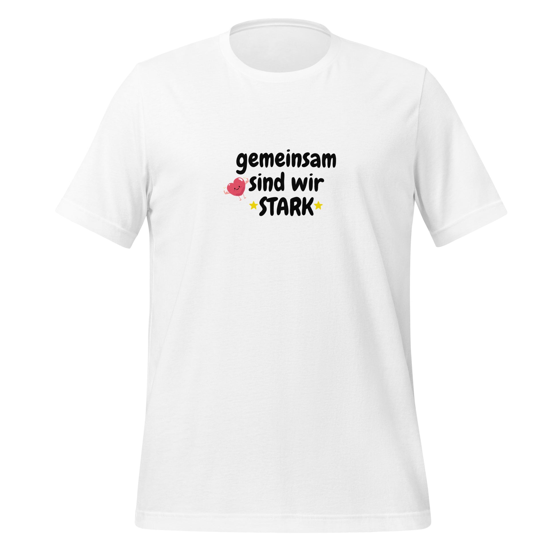The striking design features the powerful lettering "Together we are STRONG." The word "STRONG" is written in bold capital letters and flanked by two bright yellow stars, giving the shirt a cheerful accent. A pink heart with a face and flexing arms symbolizes the strength of the heart and adds a playful touch to the design.