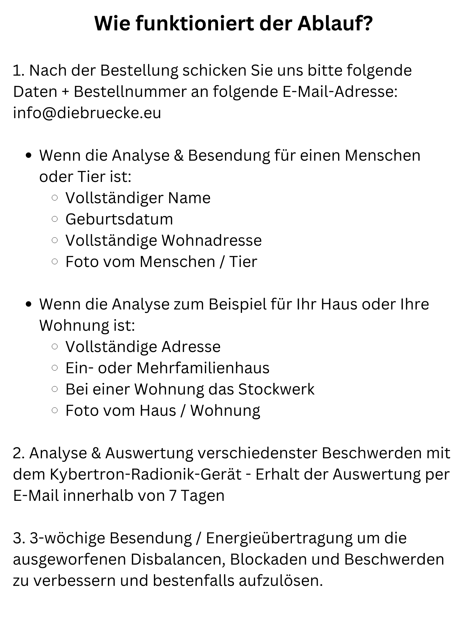 - 3-week broadcast / energy transfer to improve and ideally dissolve the thrown out imbalances, blockages and complaints.