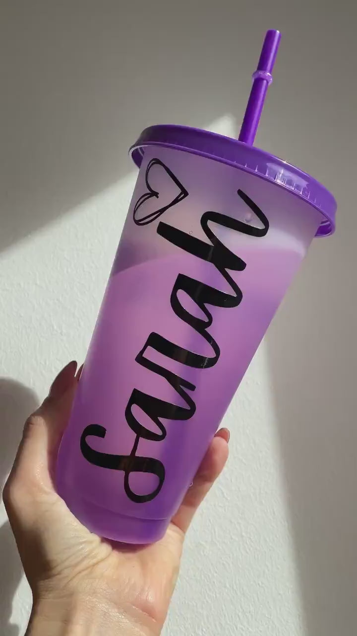 Reusable Color Changing Bottle with Lid & Straw + Personalized + Heart