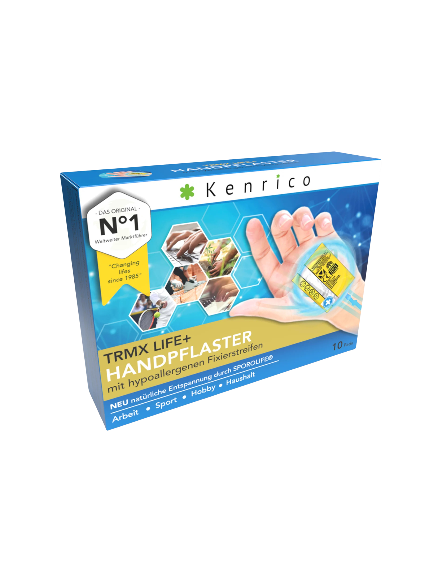 Erleben Sie die wohltuende Wirkung des TRMX LIFE+ Handpflasters von Kenrico®, dem weltweit führenden Hersteller für innovative Pflasterlösungen. Entwickelt zur Unterstützung des Handgelenks, der Handfläche und des Unterarms, fördert dieses Handpflaster mit dem einzigartigen Wirkstoff Sporolife® gezielt die Regeneration und Entspannung nach Belastungen durch Arbeit, Sport oder Alltag.
